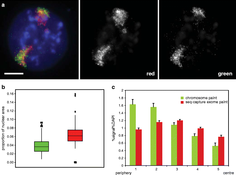 We also noted that the exome paint hybridization signal appeared to extend much further into the centre of the nucleus than the signal from the conventional chromosome paint (Fig. 3a). To quantify this we compared the relative proportion of hybridization signals from each paint across five shells of equal area eroded from the periphery (shell 1) through to the centre (shell 5) of >60 nuclei (Fig. 3c) (Boyle et al. 2001). This confirmed the relative depletion from the nuclear periphery of signal from the exome probe pool, compared with that from the conventional paint (mean signal/DAPI ratio in erosion shell 1 = 0.95 ± 0.04 for exome paint, 1.61 ± 0.13 for conventional paint, p < 0.001). Conversely, a higher proportion of exome paint signal (signal/DAPI = 0.76 ± 0.04) was in the most internal nuclear erosion shell 5 compared with signal from the conventional paint (0.52 ± 0.07, p = 0.006). Finally, there is also a significant rise in the proportion of exome paint signal in going from shell 1 (0.95 ± 0.04) to 2 (1.14 ± 0.04, p = 0.01) which is not seen for the conventional MMU2 chromosome paint (shell 1, 1.61 ± 0.13; shell 2, 1.54 ± 0.10, p = 0.67). The rather peripheral localization of hybridization signal from the conventional MMU2 paint in mouse ES cell nuclei is consistent with a previous analysis (Mayer et al. 2005).