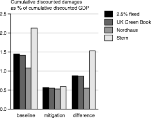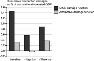 More specifically, the benefits of mitigation are presented in this paper as the discounted difference of climate change damages in the reference and mitigation scenario as share of the present value of GDP, over the time period 2010–2200