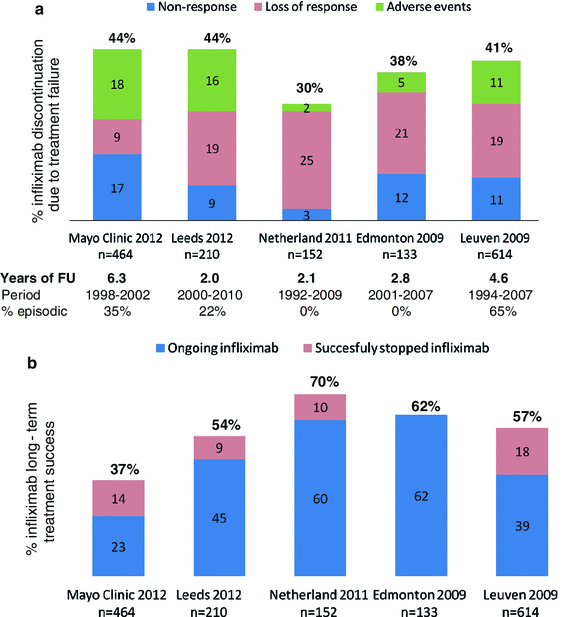 Discontinuation rates and long-term outcomes of infliximab in real-life cohorts (references are in Table 1). (1) Mayo Clinic 2012 includes the 464 patients with outcome data, (2) in The Netherlands cohort, those with <3 induction infusions and those with episodic protocol were excluded thus underestimating the primary and secondary non-response rate, (3) infliximab in those labeled as secondary loss of response was discontinued only after dose intensification in all cohorts, (4) “% episodic” refers to the percentage of patients in the cohort who were at least initially prescribed episodic infliximab treatment, (5) in Fig. 1b, the Mayo Clinic cohort had a high drop-out rate of 25 % (lost to follow-up or other technical reasons) probably accounting for the outlying lower successful rate. FU follow-up