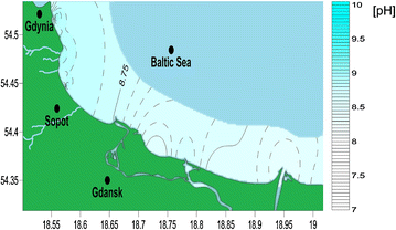 Map of seawater pH distribution along the Gdansk Bay coastline