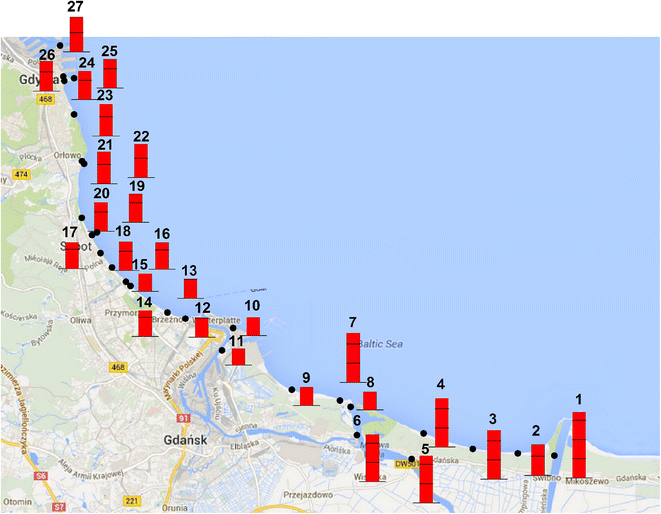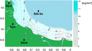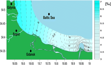 Differences in local salinity might be a result of the phenomenon of water evaporation, which increases salinity levels (Da-Allada et al. 2013). A limited water exchange in a given sea area and an uncompensated sweet water inflow result in a decrease in salinity (Zhang and Yan 2012; Rodhe and Winsor 2002). In comparison to most oceanic waters, the Baltic Sea exhibits low evaporation rates. The Baltic Sea is a marginal sea, and water exchange with the Atlantic Ocean is only possible through the narrow Danish straits. For these reasons, the Baltic Sea is considered to be a moderately salinized sea—approximately 1 % (Feistel et al. 2010). The salinity of Gdansk Bay is even lower—approximately 0.7–0.8 %—due to a high sweet water inflow, mainly from the Vistula River mouth near the Isle of Sobieszewo (Rak and Wieczorek 2012).