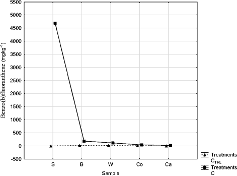 Comparative significance of carcinogenic bezo(b)fluoranthene distribution; S soil, B Bitterleaf, W Waterleaf, Co Cocoyam, Ca Cassava, C contaminated, C TRL Control. Vertical bars denote 0.95 confidence intervals