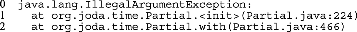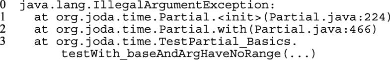 We proceeded in the same way for each Defects4J project and collected a total of 73 stack traces coming from five (out of the six) projects: JFreeChart, Commons-lang, Commons-math, Mockito, and Joda-Time. All the stack traces generated by the Closure compiler test cases are JUnit assertion failures.