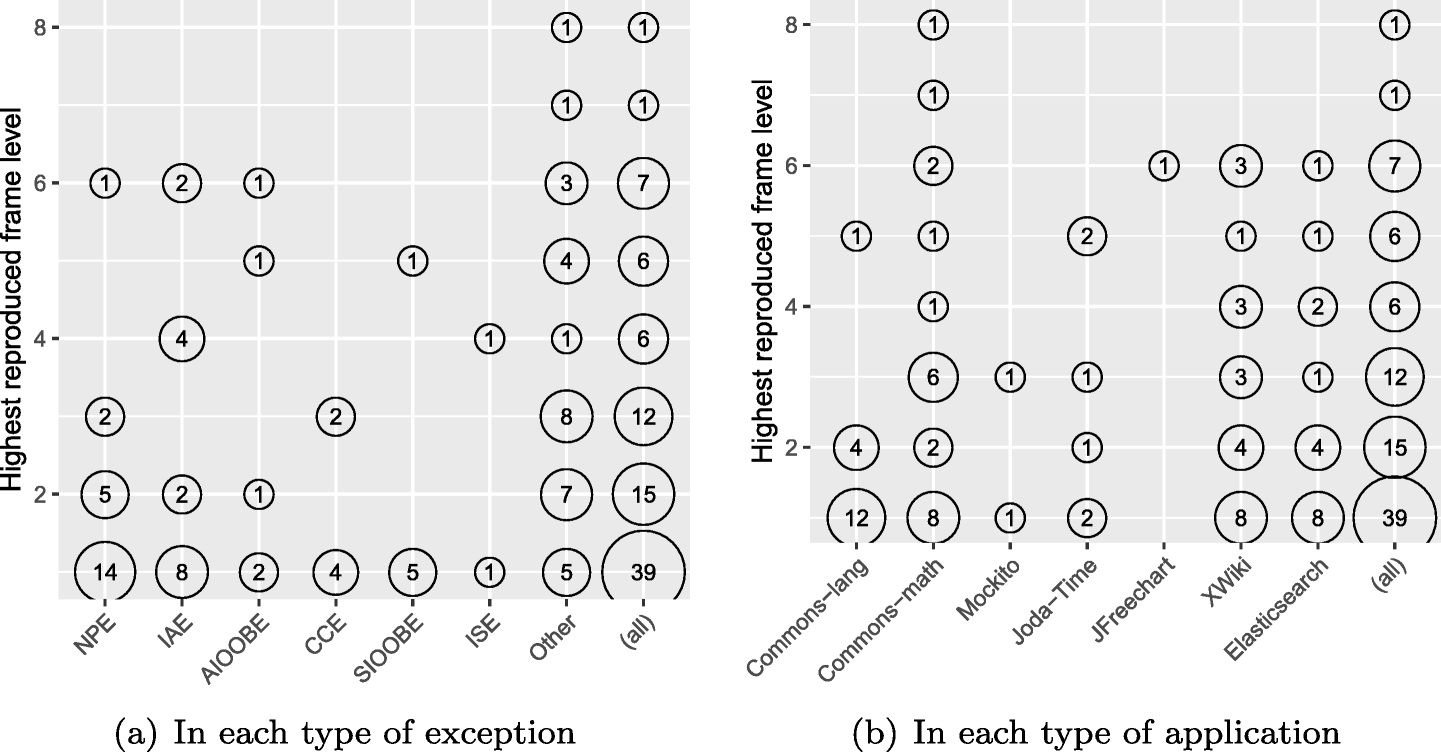 Number of stack traces (st), total number of frames (fr), and average number of frames (\(\overline {fr}\)) and standard deviation (σ) per stack trace for the different exceptions: NullPointerException (NPE), IllegalArgumentException (IAE), ArrayIndexOutOfBoundsException (AIOOBE), ClassCastException (CCE), StringIndexOutOfBoundsException (SIOOBE), IllegalStateException (ISE), and other exceptions types (Other)