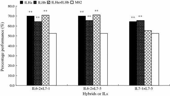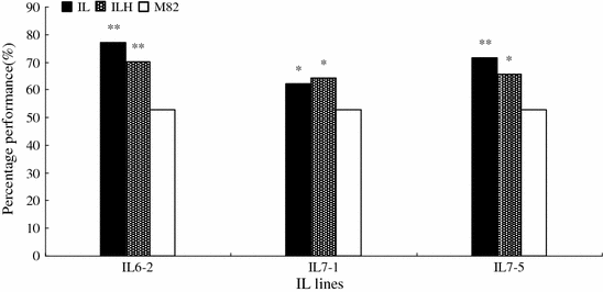 Mean value of percentage performance (%) of the lines IL6-2, IL7-1 and IL7-5 with a homozygous introgression, the recurrent parent and their hybrid * significantly different at 0.05 level; ** significantly different at 0.01 level