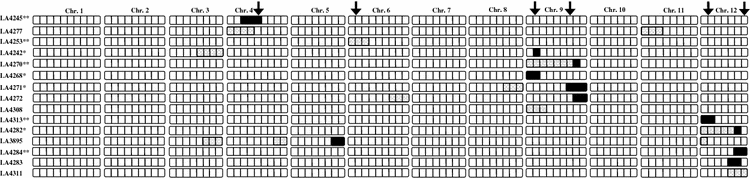 Columns indicate chromosomes and rows indicate introgression lines (ILs). Solid and shaded segments show homozygous and heterozygous introgressions in the IL respectively based on Canady et al. (2005) Thirteen out of 77 ILs from S. lycopersicoides LA2951 showed significant differences (* P < 0.05 and ** P < 0.01) as compared to the susceptible control S. lycopersicum VF36 under salt stress. Their overlapped ILs used in the screening was also presented. Black arrows indicate the most likely location of the confirmed QTLs through three experiments and/or their overlapping ILs