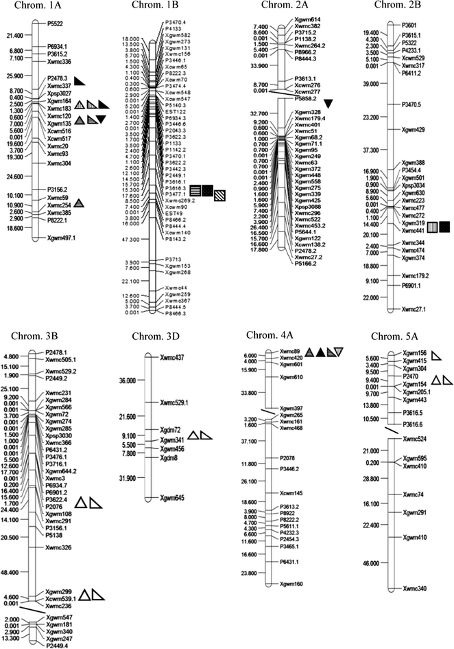 There were three QTLs for F o i.e. QF o .cgb-2B (Xgwm319–xwmc441), QF o .cgb-1B (P3616.3–P3477.1) and QF o .cgb-7D (Xgwm44–Xgwm121), one each for F m QF m .cgb-4A (Xwmc89–Xwmc420) and F v (Xgwm164–Xwmc183) which were consistently expressed when the stress was applied for different periods or intervals i.e. their expression was consistent irrespective of the duration of the stress. These consistently expressed/major/stable QTLs should be given more importance in genetic improvement for the chlorophyll fluorescence kinetics parameters. It can be further observed that 6 QTLs were clustered on linkage group 1A in the interval of Xgwm164–Xgwm135 and 4 on chromosome 4A (Xwmc89–Xwmc420) affecting F m , F v and F v /F m in different stress period intervals. In addition to these, clusters containing two QTLs for the target traits were observed on linkage group 1B, 2B, 3B, 3D, 5A and 7D. These QTLs should be given more attention for studying chlorophyll fluorescence kinetics in future mapping studies.