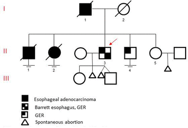 The first family member (further referred to as proband), who came to our attention is a male patient of 45 years (Fig. 1: II.3). He has been suffering from pyrosis for several years and was diagnosed in … with BE (LGD) based on histopathological examination of multiple biopsies obtained during upper gastrointestinal endoscopy. In addition, in his family there is a high incidence of BE and EAC (Fig. 1). His father (I.1) was diagnosed, in 1982 at the age of 50 years, with EAC based on histopathological examination of multiple biopsies during upper gastrointestinal endoscopy, unfortunately he died in the same year of the consequences of the disease (no tissue available). The oldest brother of the proband (II.1) was diagnosed with EAC at the age of 49 years. He underwent neoadjuvant chemoradiotherapy followed by an esophagectomy. Pathological examination of the resection specimen revealed a vital adenocarcinoma within the background of BE (HGD) located at the distal esophagus, Mandard score III–IV, ypT3N0. He died 1 month later at the age of 50 years due to post-operative complications. At autopsy, liver metastases were identified. Furthermore, the older sister of the proband (II.2) was diagnosed with a poorly differentiated adenocarcinoma at the gastro-esophageal junction at the age of 45 years and died 1 year later of the consequences of the disease. The younger brother of the proband (II.4) has been suffering from pyrosis for several years, and was diagnosed with BE (intestinal metaplasia, no dysplasia) based on histopathological examination of multiple biopsies obtained during upper gastrointestinal endoscopy at the age of 40. He was prescribed proton pump inhibitors and included in the surveillance program for BE, in the biopsies taken during the latest control no intestinal metaplasia was observed any longer. The youngest sister of the proband (II.5) did not give informed consent, and was therefore not included in the study.