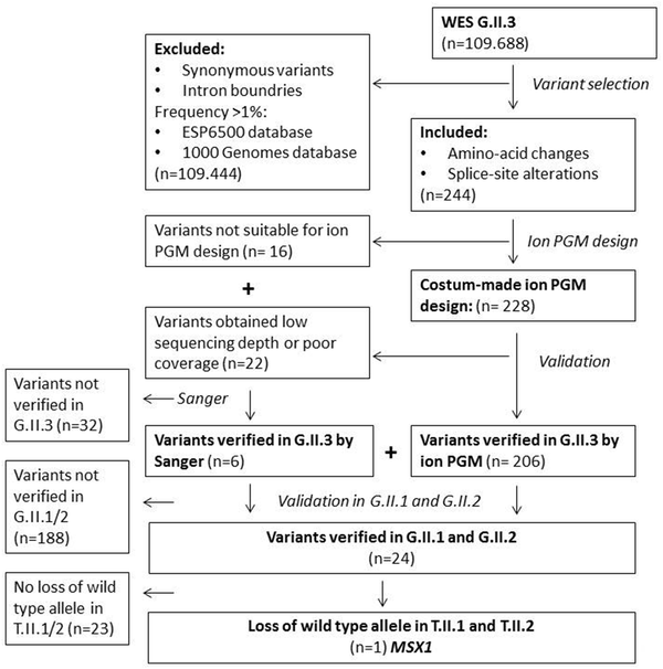 The SNP array revealed a known CNV with no clinical relevance and a CNV in an unknown gene (data not shown). Exome sequencing performed on the normal DNA of the proband (II.3) revealed after the selection procedure 244 candidate germline variants (Table 1). For 228 variants custom-made primers could be designed to confirm the data on a different platform. After sequencing on the ion PGM, 206 variants were verified successfully in the normal DNA of the proband (II.3). The remaining 22 variants obtained either low sequencing depth or poor coverage and therefore did not qualify for further analysis on the ion PGM. For the 38 variants, which could not be validated by the ion PGM, primers were designed for PCR amplification and Sanger sequencing. Of the 38 variants, six were validated in the normal DNA of the proband (II.3) by Sanger sequencing. Leaving 212 potential germline variants of interest, which were validated in the family members (Fig. 2).