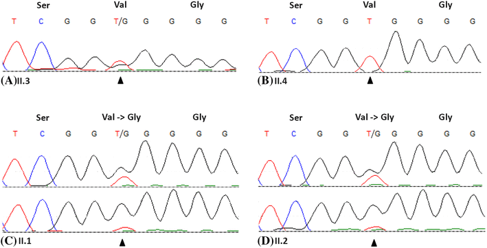 Sanger sequencing results of MSX1. a Sanger sequencing of normal DNA of the proband (II.3) confirmed the presence of the heterozygote variant (c.359T > G) in MSX1. b Sanger sequencing of normal DNA of youngest brother of the proband (II.4) revealed no variant in MSX1. c Sanger sequencing of normal DNA (upper panel) and tumor DNA (lower panel) of the oldest brother of the proband (II.1) confirmed the presence of the heterozygote variant (C.359T > G) in MSX1 in normal DNA and loss of the wild type allele in tumor DNA which changed the codon 120 from Valine into Glycine (P.V120G). d Sanger sequencing of normal DNA (upper panel) and tumor DNA (lower panel) of the older sister of the proband (II.2) confirmed the presence of the heterozygote variant (c.359T > G) in MSX1 in normal DNA and loss of the wild type allele in tumor DNA, which changed the codon 120 from Valine into Glycine (p.V120G)