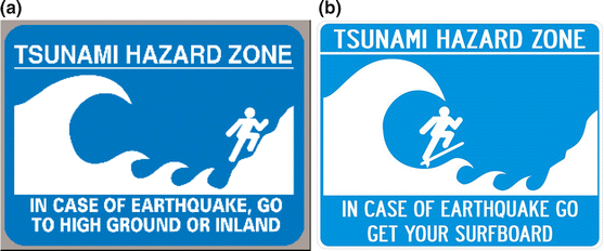 While it is not always a drawdown (withdrawal of the sea) that occurs first, the question remains as to why we persist with an image that is wrong in most cases. While it might be argued that the effectiveness of the signage rests not on literal interpretation, a preliminary study of the effectiveness of warning signs in Thailand found that “Most signs as symbols … are adapted from international hazards symbols. Though, some of those signs and symbols can be underst[ood] … a number of them are still not appropriate and adaptable by the local community” (Imsuwansakorn 2012, 43). More research is clearly needed on the efficacy of international hazard symbols, and in particular, the utility of incorrectly depicted tsunamis (for instance, Fig. 3a) that then need to be interpreted in situ.