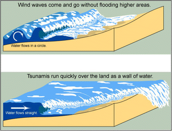 According to University of Hawaii at Hilo…. You can’t surf a tsunami because it doesn’t have a face. Many people have the misconception that a tsunami wave will resemble the 25-foot waves at [famous surfing beaches], but this is incorrect: those waves look nothing like a tsunami. On the contrary, a tsunami wave approaching land is more like a wall of whitewater. It doesn’t stack up cleanly into a breaking wave; only a portion of the wave is able to stack up …. Since the wave [can be] … 100 miles long and the tail end of the wave is still traveling at 500 mph (about 800 kph), the shore end of the wave becomes extremely thick, and is forced to run far inland, over streets and trees and houses. (http://indosurflife.com/2013/12/why-you-cant-surf-a-tsunami/, last accessed 19.1.2015)