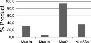 Shortening of the total chain (Muc1a’) did not change the preference but reduced the transfer rate. Changing the Thr to Ser in the previously preferred glycosylation site of this peptide abolished its acceptor qualities totally (CHT 24). This is surprising as a Ser residue in a similar good neighbourhood Thr-Thr-Pro-Ser-Pro-Val-Pro is the enzyme’s first choice in Muc5Ac.