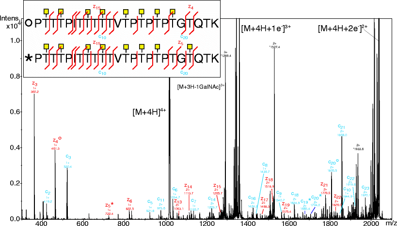 Annotated ETD-MS/MS spectrum. Muc2 peptide with eight GalNAc residues [M+4H]4+ at 1018 m/z was taken as a precursor for the ETD reaction. Analysis of the fragment ion masses revealed the amino acids carrying a GalNAc modification. Two different forms (indicated with ° and *), slightly differing in modification site of the most C-terminal GalNAc were identified (see insert). Fragment ions marked with ° or * enabled the differentiation between the two glycopeptide forms
