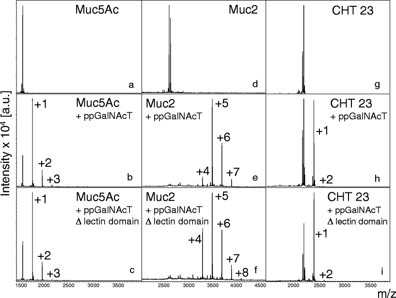 MALDI-TOF ([M+ Na]+) analysis of the transfer of GalNAc residues using Muc5Ac, Muc2 or CHT 23 as acceptor peptide. Acceptor peptide without incubation (a,d,g); 8-h-incubation with ppGalNAcT containing the lectin domain (b,e,h); 8-h-incubation with ppGalNAc without the lectin domain (c,f,i). The numbers indicate the incorporated GalNAc residues