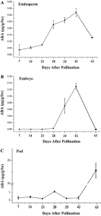 Abscisic acid (ABA; free form) is a naturally occurring physiological growth hormone of higher plants. A detailed study involving the time course growth of developing seed tissues associated with endogenous levels of free ABA were investigated using a novel enzyme-linked immunosorbent assay. Seed filling in castor (Ricinuc communis L.) endosperm, embryo, and pod is marked with a rapid increase in fresh weight during the mid-developmental stages [21–42 days after pollination (DAP)], followed by a steady decline at the maturation stages (42–63 DAP) accompanied with a rapid lipid synthesis (in endosperm and embryo) during the same period, except for in pod. Endogenous ABA levels in endosperm (0.001–0.32 μg/g) and embryo (0.003–0.13 μg/g) followed a concurrent pattern with seed reserve filling, showing a rapid increase during the mid-developmental stages 21–42 DAP, whereas ABA levels in seed pod (0.2–22.9 μg/g) showed a different accumulation pattern with rapid increase and decline during the early-mid developmental stages, preceded by the maximal increase during the maturation stage (63 DAP). Together, our results provide evidence for the association of endogenous ABA in seed filling as well as in reserve deposition and provides clue for the effective usage of exogenous ABA concentrations in developing seeds with a focus, on improving seed reserve complex in castor.