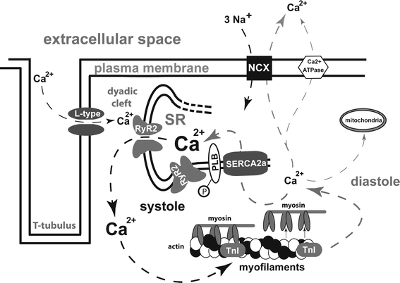 During phase 0 of an action potential fast Na+-influx leads to a steep increase of the membrane potential increasing the probability that the voltage dependent L-type Ca2+ channels will open. Thereupon Ca2+-ions passively drawn by a concentration and electrochemical gradient enter the cytoplasm and maintain the plateau phase of the action potential. Inside the cell, they bind to ryanodine receptors type 2 (RyR2) that are located on the surface of the SR and trigger the release of an even bigger amount of Ca2+ out of the SR. This mechanism of Ca2+-induced Ca2+ release leads to a prominent increase in cytosolic Ca2+ that binds to troponin C (TnC) and thereby induces actin–myosin interaction. In diastole, Ca2+ has to be eliminated from the cytosol to allow relaxation of the myofilaments. This is mainly achieved by an active, energy-consuming Ca2+-reuptake into the SR via the sarcoplasmic reticulum Ca2+-ATPase type 2a (SERCA2a). A smaller amount of Ca2+ is extruded out of the cell via the Na+/Ca2+-exchanger (NCX), which is a facilitated diffusion in which the electrochemical potential gradients of Na+ and Ca2+ are the source of energy to drive the transport. NCX in its “forward” mode produces an electrical current because 3 Na+ are exchanged for 1 Ca2+. In human cardiomyocytes, the reuptake of Ca2+ into the SR makes up for approximately 70 % of the systolic Ca2+ depending on the heart rate [10]. Around 28 % are pumped out of the cell via NCX. The remaining 2 % are allotted to Ca2+ uptake into mitochondria and elimination via Ca2+-ATPases in the plasma membrane [11].
