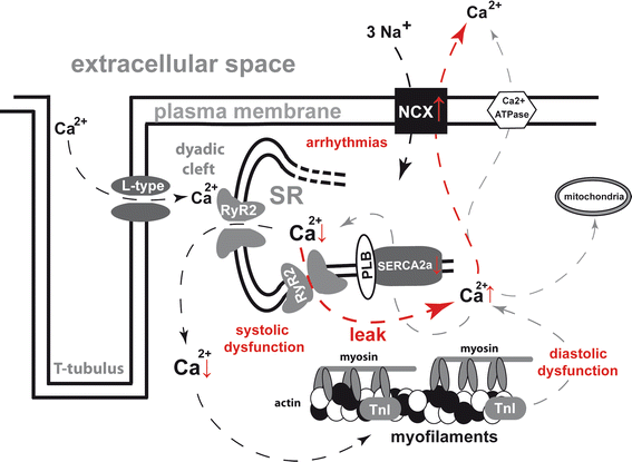 Deteriorations of excitation–contraction coupling in heart failure; arrows indicate Ca2+ shifts in systole (left) and diastole (right); diastolic Ca2+ leak is highlighted in red; changes in protein function and ion concentrations are indicated by vertical red arrows; ↑ increase; ↓ decrease; L-type L-type Ca2+ channel; RyR2 ryanodine receptor type 2; SR sarcoplasmic reticulum; PLB phospholamban; TnI troponin I; NCX Na+–Ca2+-exchanger; SERCA2a sarcoplasmic endoplasmic reticulum Ca2+-ATPase 2a; P phosphate