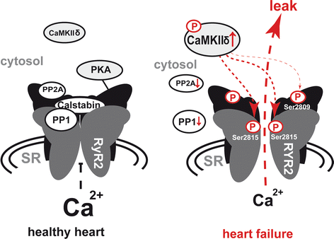Development of an increased diastolic Ca2+ leak in heart failure; normal diastolic ryanodine receptor 2 (RyR2) closure (left) vs. diastolic SR Ca2+ leak due to spontaneous opening of a hyperphosphorylated RyR2 complex (right); the four subunits of the RyR2 complex are illustrated in grey and black; the diastolic leak is highlighted in red; relevant phosphorylation sites at the RyR2-protein are indicated; changes in protein function are indicated by vertical red arrows; ↑ increase; ↓ decrease; SR sarcoplasmic reticulum; PP1 protein phosphatase 1; PP2A protein phosphatase 2A; CaMKIIδ Ca2+ calmodulin depending kinase IIδ; PKA protein kinase A; P phosphate