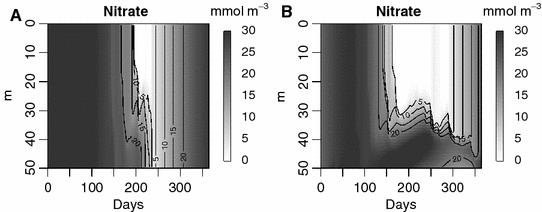Water-column nitrate concentrations for the mixed (A) and stratified (B) conditions, as modeled for a winter water-column DIN concentration of 30 mmol m−3