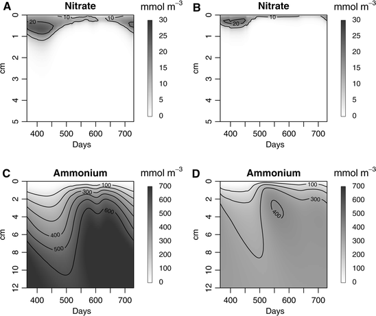 Spatiotemporal plot of sediment nitrate (A, B) and ammonium (C, D) concentrations for the well-mixed (A, C) and stratified (B, D) conditions, as modeled for pelagic winter DIN concentrations of 10 mmol m−3