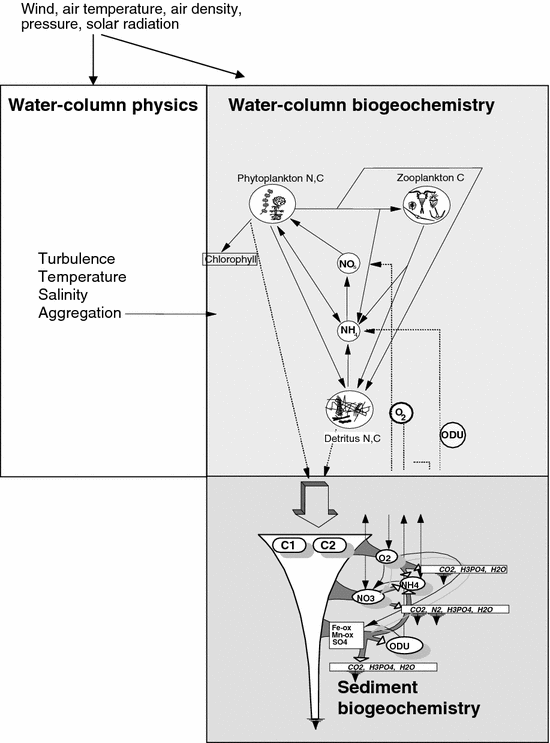 Schematic representation of the three coupled submodels describing the water-column physics (left), water-column biogeochemistry (right), and sediment biogeochemistry (below)