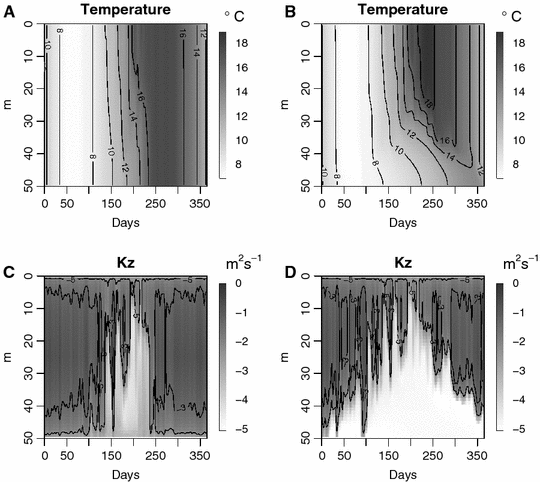 Spatiotemporal plot of water-column temperature (A, B) and diffusion coefficients (C, D) for the mixed (A, C) and stratified (B, D) conditions