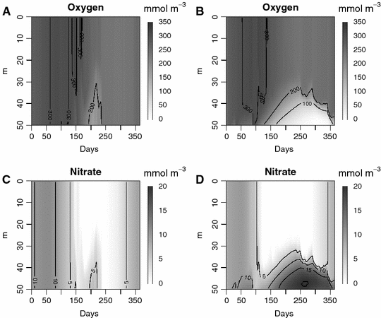 Spatiotemporal plot of water-column oxygen (A, B) and nitrate (C, D) concentrations for the mixed (A, C) and stratified (B, D) conditions, as modeled for a winter water-column DIN concentration of 10 mmol m−3