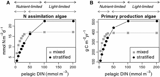 Algal uptake of dissolved inorganic nitrogen (A) and primary production (B) as a function of increased mean pelagic DIN concentrations for the mixed and stratified scenarios. The top of the diagram indicates where the algae are on average “nutrient limited” or “light limited” for the well-mixed (gray line) and stratified (black line) conditions