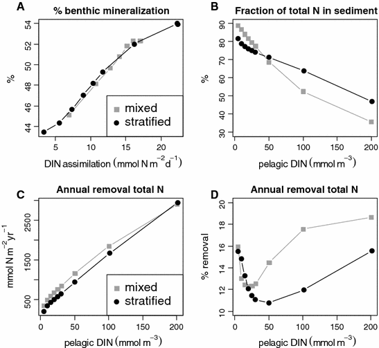 Consistent with the above-mentioned measurements, this model predicts (slightly) lower nitrogen removal efficiencies under thermal stratification, albeit for different reasons. In both stratified and well-mixed conditions, the sediment functions similarly with respect to benthic removal of reactive nitrogen: compared to total sediment mineralization, the relative importance of denitrification in both scenarios is similar and varies between 8–15% and 7–20% for the stratified and mixed case, respectively. The slightly lower overall removal during stratification (Fig. 7C) arises because, for similar pelagic DIN concentrations, algal production is lower (Fig. 5A); therefore, the supply of organic matter and thus sedimentary mineralization and denitrification are also lower.