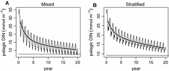 Pelagic DIN concentration versus time (20 years) for the 50% reduction scenario in the mixed (A) and stratified (B) case. The thick line shows the annual-averaged concentrations versus time. The thin horizontal line denotes the ultimate equilibrium concentration