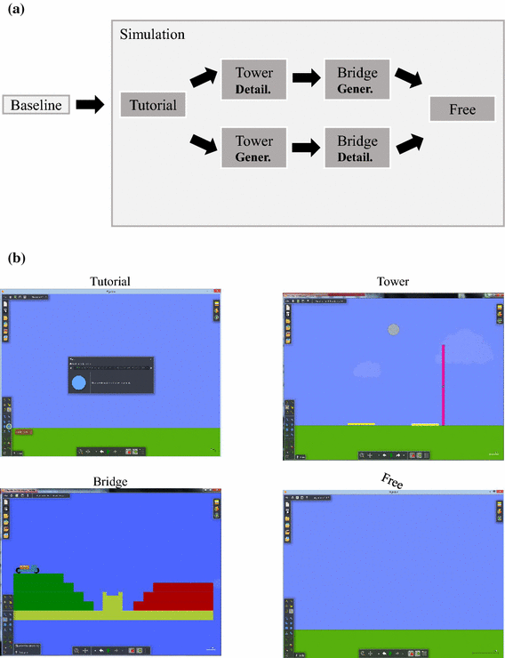 Research design overview and the tasks. a research design steps, b layout of the start screen of the simulation software: Tutorial (upper left hand side), tower (upper right hand side), bridge (lower left hand side) and free (lower right hand side)