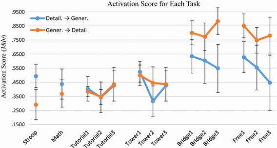 Based on our findings, we reject the idea that the detailed instructional mode would induce a linear increase in the level of activation—instead, what we observed was a reinvestment of energy (U-shaped curve). Moreover, this activation pattern does not appear to be affected by the sequence of instructions in the Tower and Bridge tasks, and it is interpreted as an attribute of the mode of instruction given.