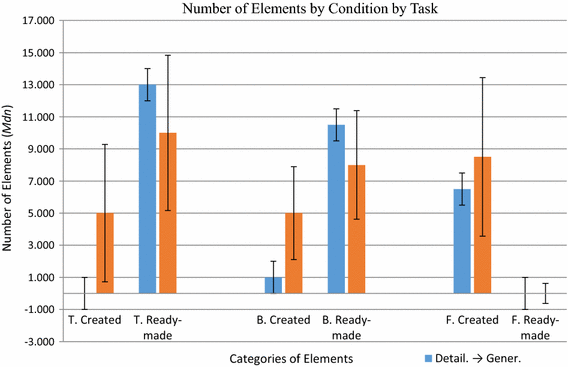 Scene evaluation: median of the number of elements created or ready-made by category and task, T Tower B Bridge and F Free