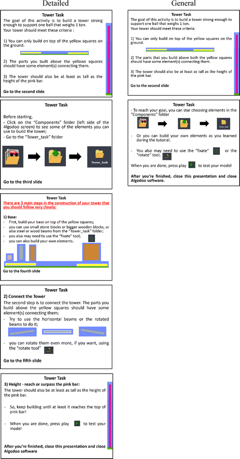 In the first activity, a standard-tutorial guided students through the main tools and techniques of Algodoo® (Algoryx Simulation AB 2013) (the tutorial is included in the software). This activity had no time limitation. The instructions for the Tower and Bridge tasks were created by the researchers and given to students as PDF documents, which were displayed on a window beside the Algodoo® (Algoryx Simulation AB 2013) software window. Both windows remained open on the computer screen throughout the task. The detailed instructions provided information on the basic characteristics that the Tower and Bridge ought to have, while general instructions presented the general requirements for the task. Examples of the slides used for detailed and general instruction for the Tower task are shown in appendix 1, Fig. 6.