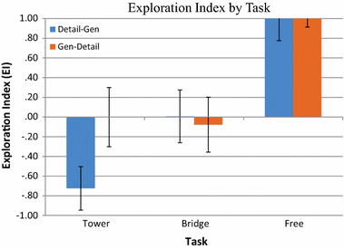 Exploration index (EI) for each group and task (Tower, Bridge, Free). Bars represent means, whiskers show standard errors