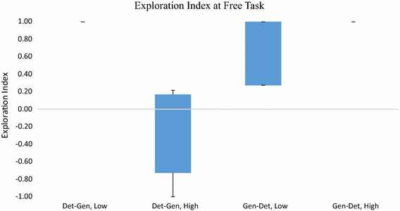 Considering that the activation response is a consequence of a subjective state toward some demand, including emotional effort (Choi et al. 2010; Muldner et al. 2010), cognitive load (Shi et al. 2007), or stress (Fechir et al. 2008) and favoring exploitation (Nieuwenhuis et al. 2011), our hypothesis concerning this particular finding is that the detailed instruction mode evoked an increase in activation near the completion of the task, increasing the behavioral propensity to implementation, possibly as the result of the perceived stress due to the deadline. That is, the necessity of meeting the detailed requirements given by someone else, within the allotted time, could be the key for generating pressure to complete the task and the perception that students are far from done, increasing the arousal in the final segment, even though it does not surpass the activation level in the beginning of the task. On the other hand, in the circumstances generated by the other instructional mode, the opposite hypothesis appears valid: given the same amount of time to finish the task, students in the generic condition felt freer to complete the task without the pressure of a deadline. However, the detailed instructional mode appears to induce a task-related cognitive mindset, or orienting response, disposed to the fulfillment of the task utilizing the materials already provided by the software, while generic instructions seem to lead to a more exploratory approach. This hypothesis is better supported by the finding that the students receiving detailed instruction in the first task had the smaller EI and both groups had the higher index in the Free task, where no instructions or goals were given.