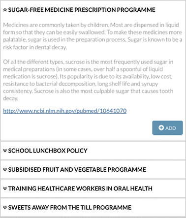 A screenshot from GRAPHIC-II showing some examples of health promotion interventions with a function to add a selected intervention