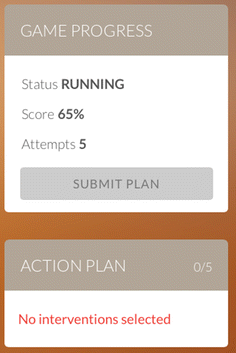 A screenshot from the game showing how students can view their progress and a box to present what interventions have been selected to their ‘action plan’