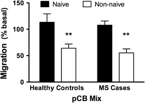 Since Cannabis therapy may be for symptom palliation by individuals with MS (Boven et al. 2006; Mikita et al. 2011), we addressed the question: “Does chronic Cannabis use induce a phenotypic change in circulating monocytes?” Monocyte cell migration was significantly inhibited by a mixture of pCBs in non-naïve subjects irrespective of whether these individuals are cases or controls. We previously reported that subjects naïve to Cannabis have an increased migratory response to CCL2 (Sexton et al. 2012). CCL2 (monocyte chemo-attractant protein 1, MCP1) provides a strong chemotactic cue for monocytes, guiding these cells to inflammatory lesion sites throughout the body, including the brain (Conductier et al. 2010). Our results suggest that while cannabis use affects the cell migration properties of circulating monocytes, it does not affect the serum levels of CCL2, a major chemotaxic cue for these cells (Fig. 2a).