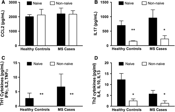 Serum Cytokine Levels: Using a bead array assay we measured CCL2, IL17 and panels of Th1 and Th2 cytokines. a There was no significant difference in the level of CCL2 across cohorts. b Levels of IL17 were significantly reduced in both cohorts who were current Cannabis users (non-naïve), compared to naïve subjects. c, d Levels of both Th1 and Th2 cytokines were significantly suppressed (undetectable in some cases) in current Cannabis users compared to naïve subjects (2-way ANOVA followed by Bonferroni’s post-test)