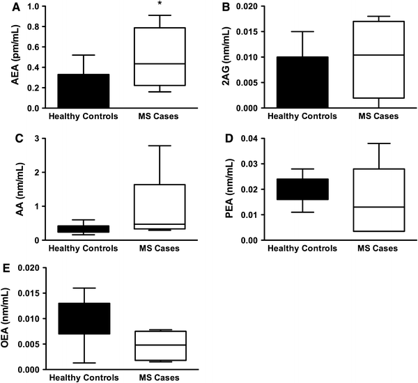 Serum levels of endocannabinoids (eCB): Using HPLC/MS/MS we measured serum levels of 5 eCBs. a Serum AEA levels were elevated in patients with MS compared to controls. b–e We found no significant differences in the levels of 2AG, AA, PEA or OEA between healthy controls and MS cases. However, there was a trend for elevated 2AG and AA in patients with MS compared to controls. These data are not presented as stratified for Cannabis exposure as there were no significant differences in that regard (two-tailed, paired t tests)