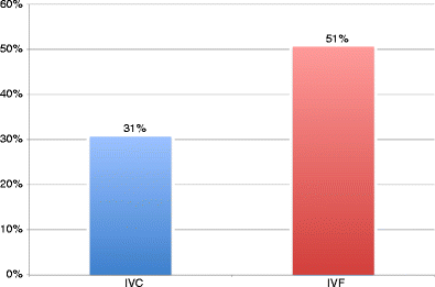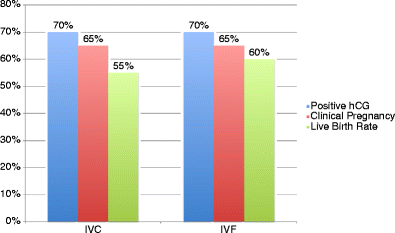 Pregnancy rates for IVC (n = 20) and IVF (n = 20)