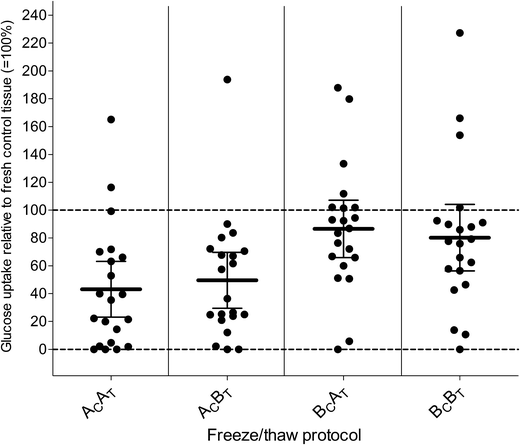 As expected, the highest glucose uptake was found for fresh tissue (23.5 nmol/mg/h). Note that the range of glucose uptake by the tissues derived from individual patients was large (range 8.3–32.7 nmol/mg/h), demonstrating a large inter-patient variability. Independent of the thawing protocol, tissue cryopreserved according to protocol BC had a significantly higher glucose uptake when compared to AC (BCBT 16.3 and BCAT 17.3 vs ACBT 7.1 and ACAT 8.7 nmol/mg/h, Table 1). In Table 2, the estimated differences of the glucose uptake between the cryopreservation and thawing protocols—as obtained by a linear-mixed model for repeated measurements—are presented. According to this model, tissue that was cryopreserved using protocol BC showed a statistically significant higher glucose uptake (6.8 nmol/mg/h higher; p < 0.001) than tissue cryopreserved using protocol AC (Table 2). A small difference in glucose uptake (1.7 nmol/mg/h) was found in favor of the shorter thawing protocol A T when compared to BT, but this difference did not reach statistical significance (p = 0.051; Table 2).