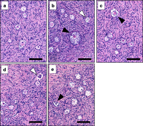 Follicle morphology after different combinations of cryopreservation and thawing protocols. Follicle morphology was determined by analysis of hematoxylin-/eosin-stained sections of ovarian cortex tissue before (panel a) and after cryopreservation and thawing according to cryopreservation protocol AcAT (panel b), protocol AcBT (panel c), protocol BcBT (panel d), and protocol BcAT (panel e). In panels b–e, the follicles with pyknotic nuclei (black arrow heads) and cytoplasmic shrinkage (white arrow heads) are indicated. Bars represent 100 μM