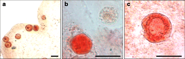 Follicles visualized by neutral red staining. a Overview of living follicles of various sizes as visualized with the neutral red viability stain. Due to the thickness of the squash preparation, not all follicles are in focus. b Fresh tissue with a viable follicle (red) and dead follicle (transparent). c Close-up of a living follicle. Bars represent 200 μM