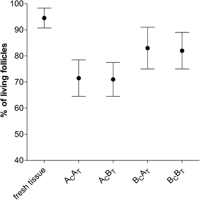 To differentiate between cryopreservation (C) versus thawing (T) related effects, four combinations of these two (A and B) very different cryopreservation/thawing protocols (ACAT, ACBT, BCAT, BCBT) were studied. Before and after cryopreservation and thawing, the percentage of living and morphologically normal follicles, as well as the overall tissue viability, was assessed.