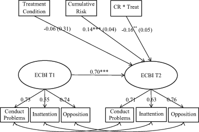 Cumulative risk and child behavior change in PMTO interventions vs. regular care. Autoregressive SEM analysis, posttreatment (T2) regressed on pretreatment behavior (T1). Note: Eyberg Child Behavior Inventory—intensity scale (ECBI). Interaction variable Cumulative Risk multiplied by Treatment Condition (CR * Treat). Coefficients were standardized on Y (equals Cohen’s d), standard error is displayed in parentheses. Model fit information: X 2(df) = 27.0 (20), CFI = 0.99 TLI = 0.99 RMSEA = 0.06. ***p < 0.001; **p < 0.01; *p < 0.05