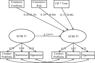 Cumulative risk and child behavior change in PMTO interventions vs. regular care. Autoregressive SEM analysis, follow-up (T3) regressed on pretreatment behavior (T1). Note: Eyberg Child Behavior Inventory—intensity scale (ECBI). Interaction variable Cumulative Risk multiplied by Treatment Condition (CR * Treat). Coefficients were standardized on Y (equals Cohen’s d); standard errors are displayed in parentheses. Model fit information: X 2( df) = 36.3 (20), CFI = 0.98 TLI = 0.97 RMSEA = 0.05. ***p < 0.001; ** p < 0.01; *p < 0.05; † = 0.059