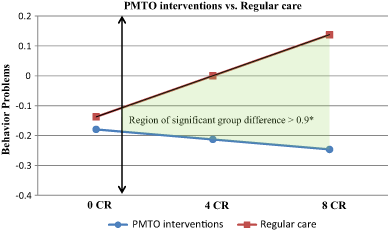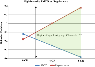 In this study, we had the advantage of using experimental data gathered in the Norwegian regular care system for children with behavior problems. However, several limitations should be considered. Admittedly, combining risk factors into a cumulative risk index will, to some extent, obscure the etiology of social risk. We also applied an equal weights assumption when we pooled the dichotomized risk factors, and we combined risk factors from different domains, such as family demographics and parental health. However, we can offer insights into how different amounts of risk exposure affect health care outcomes for children with behavior problems. The predictive validity of our cumulative risk index supports this notion. Moreover, although we adhered to previously established cut-offs in cumulative risk research, one may still argue that the process of dichotomization inflicts arbitrary limits on risk factors. Nevertheless, evidence is very limited regarding cumulative risks and the outcomes of care for behavior problems. Thus, the effects of cumulative risk must be replicated in other samples and contexts. Moreover, the RCT design evaluating treatment intervention packages, such as PMTO, did not allow us to address which treatment components that produced the compensatory effects of PMTO (Collins 2014). Other approaches, such as factorial designs, might be more appropriate for elaborating further on the change mechanisms related to cumulative risk that is at work in parent training.